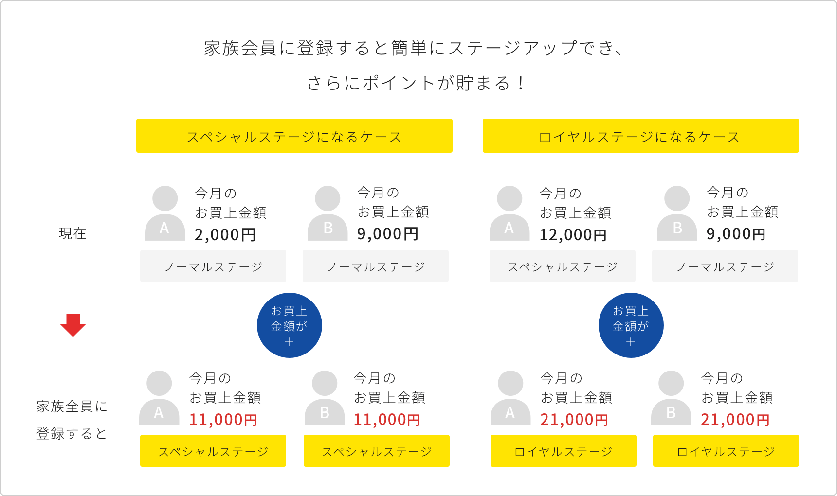 さらに家族会員登録でステージアップも簡単になり、どんどんポイントが貯まる!